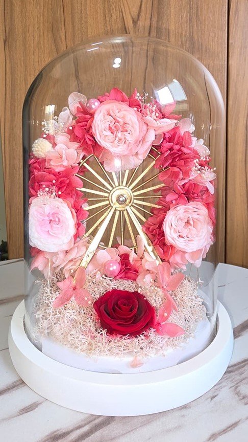 Bring timeless beauty to any room with this preserved flower dome featuring a radiant gold Ferris wheel centerpiece. Premium real flowers that last for years, this makes a perfect gift or home decor piece.